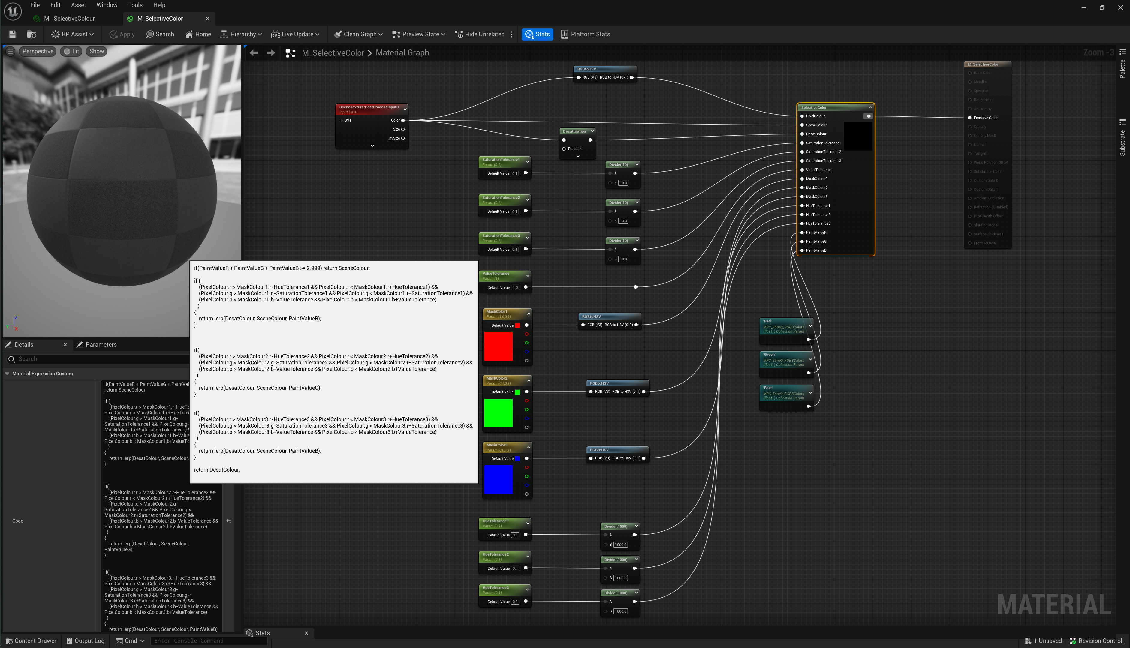 Worked out why the selective colour was desaturating: the way I was using ‘if’ nodes to chain each selective colour pass was derp. I wrote a custom shader that checks each pixel against three hue ranges. If it’s within a certain tolerance, I lerp from desaturated to full colour based on the amount of paint the player’s collected. This does exactly what I was after.
