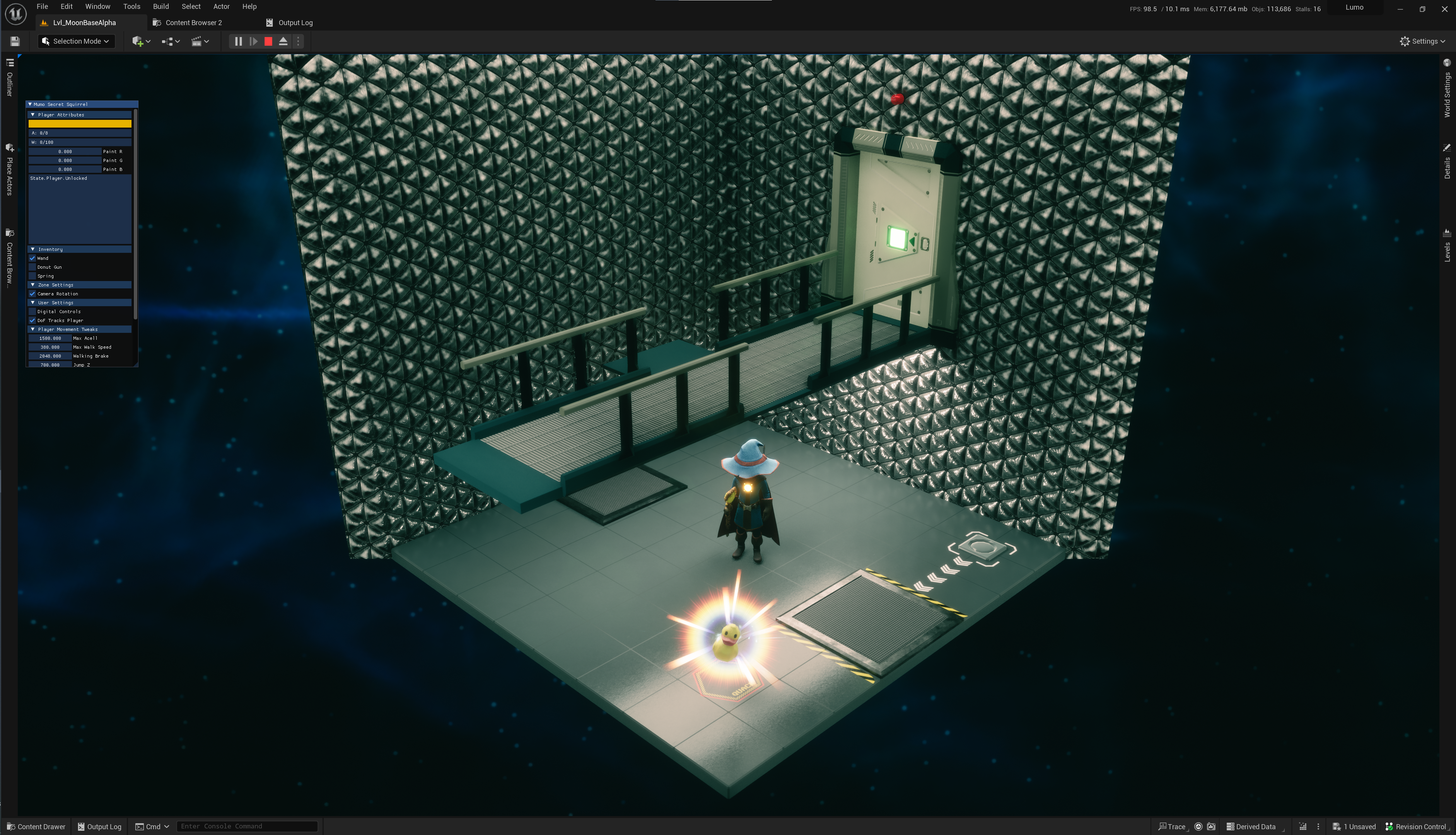 Given the walls fade in & out, depending on camera rotation, I thought it might be cool to have objects in the world fade in and out based on vertical height, so I think this will be the room where I try that out. The trapdoors in the centre hide a lift that’ll take the player to the ship’s 2nd level. When they’re on this, they’ll get a good view of the effect and, hopefully, be curious to try and get there.