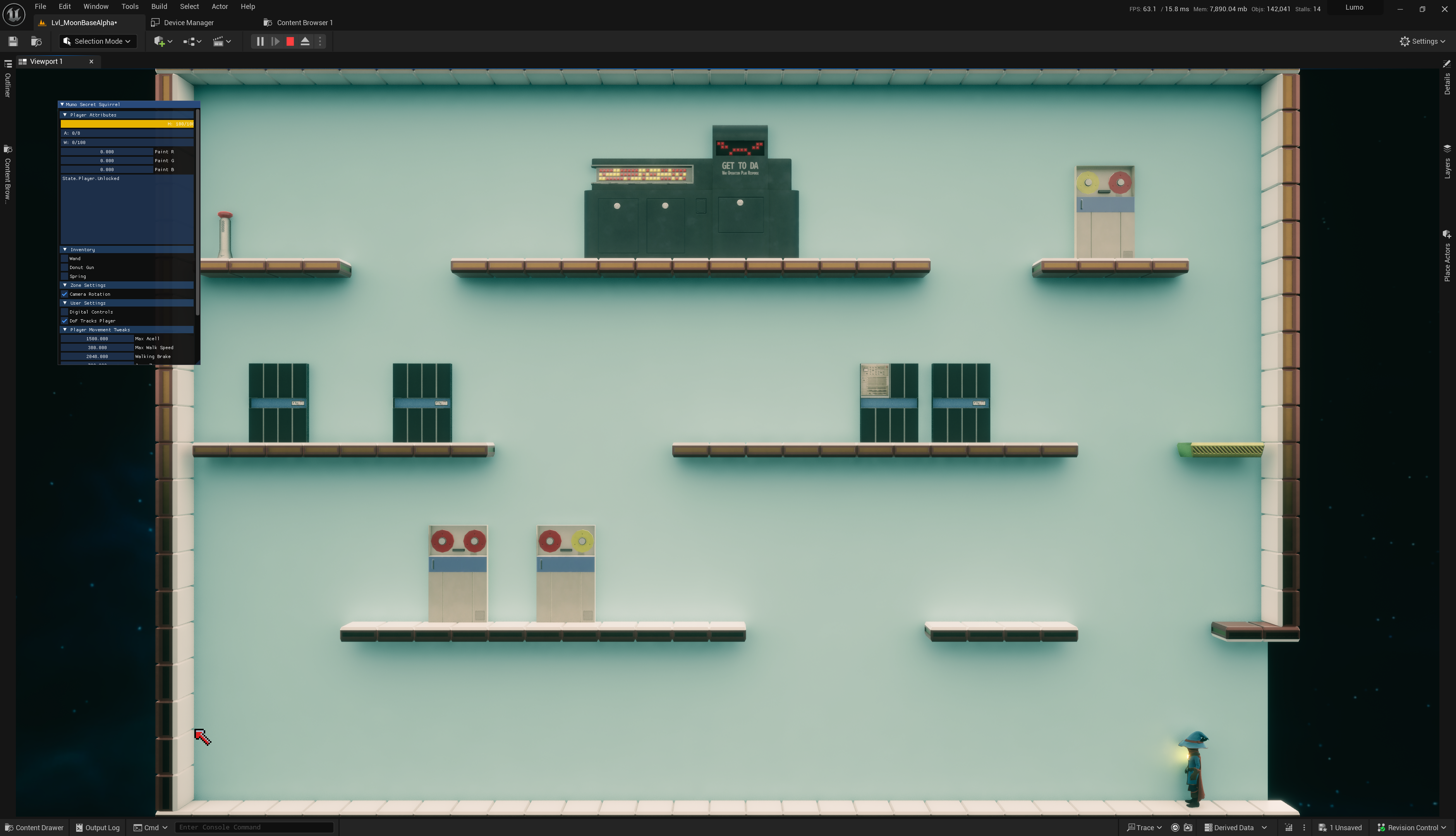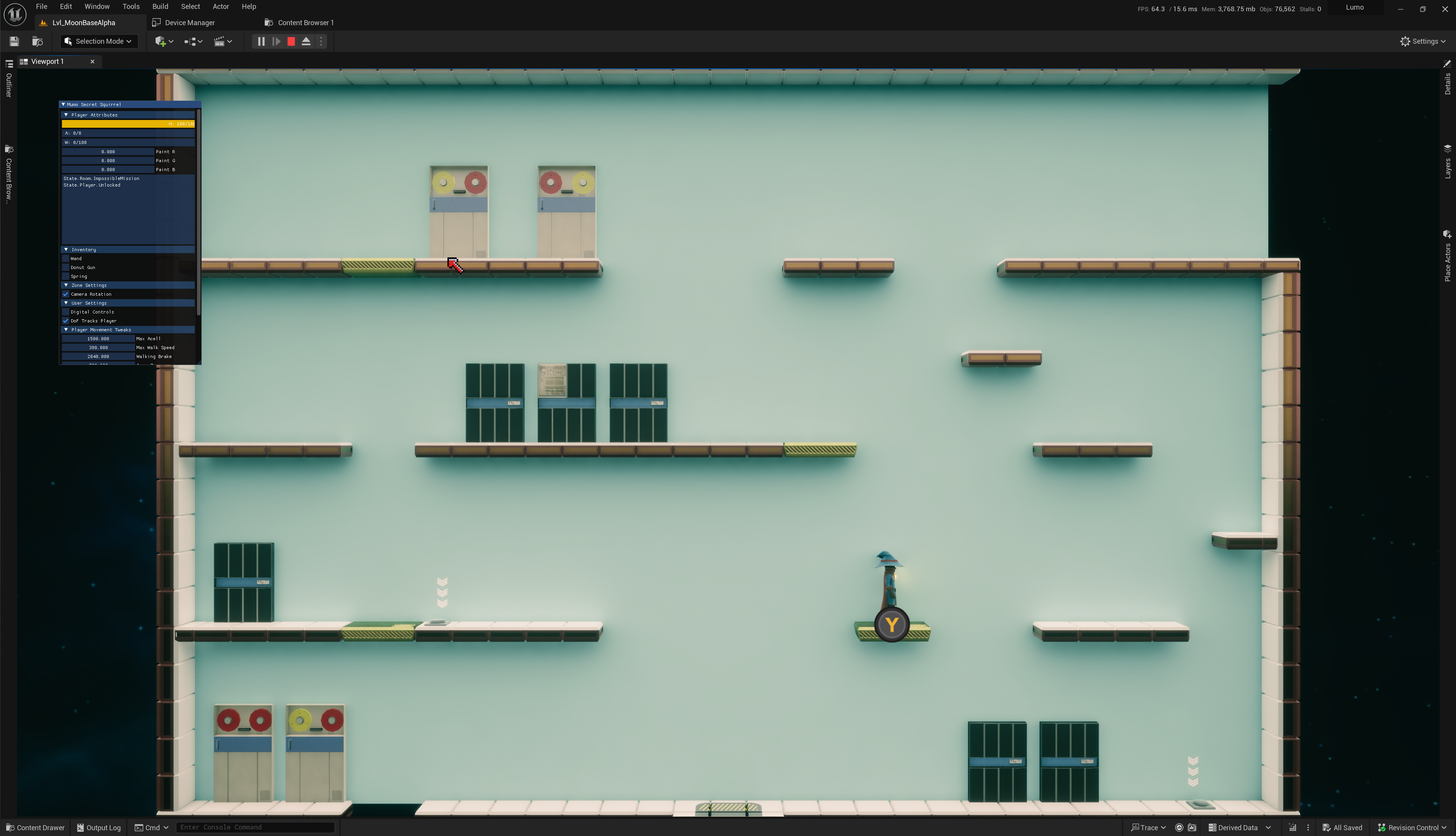 Laid out two lift rooms – would be rude not to, they’re iconic – and a room for a WOPR computer (War Games reference, ask your Grand Dad), that’ll provide the key when searched. The room transitions are working, but I made some tweaks to how Room Controllers
