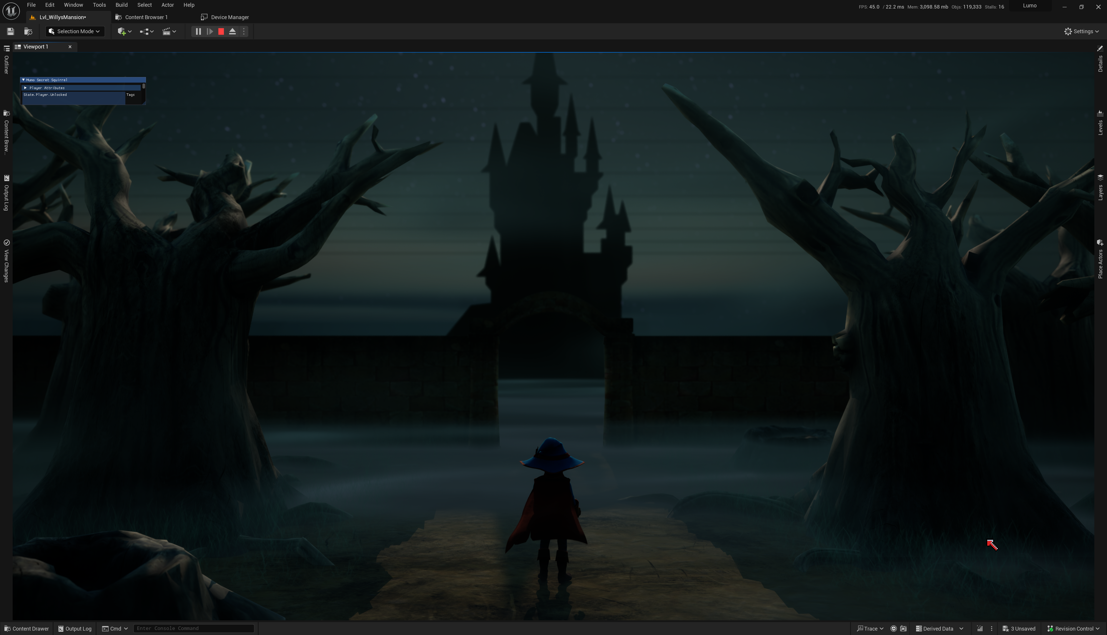 The best bit: I discovered the Wind Source, in UE. The player’s cape blows around in the wind! :D