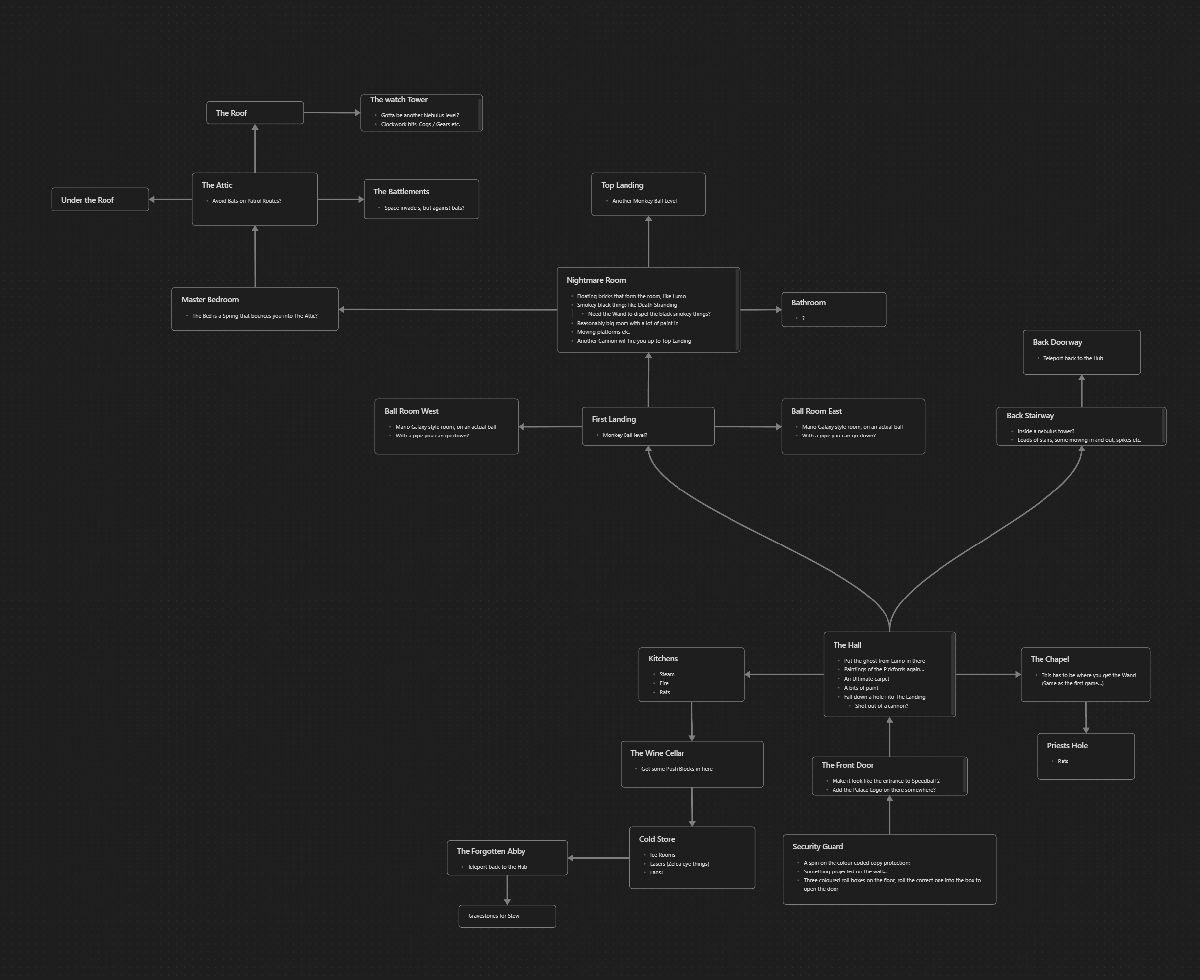 A lot of people have been talking about LLMs and ChatGPT, lately. I’ve never really played with AI much – I hate the look of those picture generators, for a start – but I did play around with ChatGPT before I started on this project and I asked what it would do with a sequel to Lumo. It suggested setting one of the zones in Miner Willy’s Mansion, which tickled me. It’s not a bad idea; each of the room names could be spun into something entirely different, so I decided to run with it. Today, I sketched out some of the ideas that have been bubbling away.