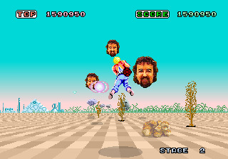 Annnd… I made myself laugh again: Space Harrier, right, but instead of the boss that’s a head made from rock, it’s the floating head of Kevin Toms!