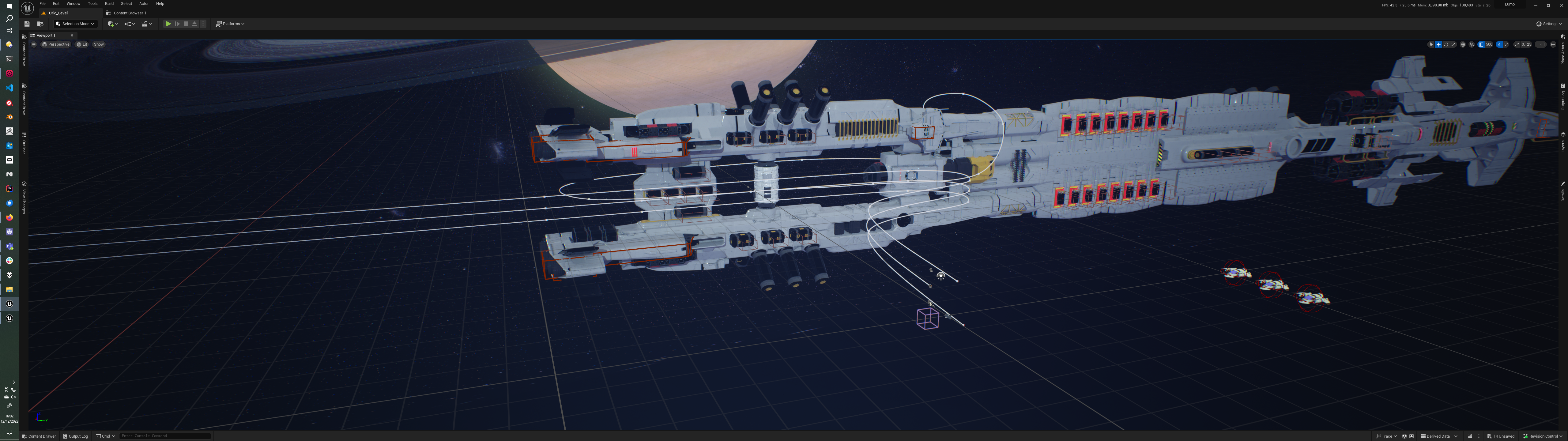 Didn’t get much done today. I had to do paperwork for the accountant, and grade a some student projects… But I did write a generic “wave spawner” that throws ships, on a timer, down my splines.