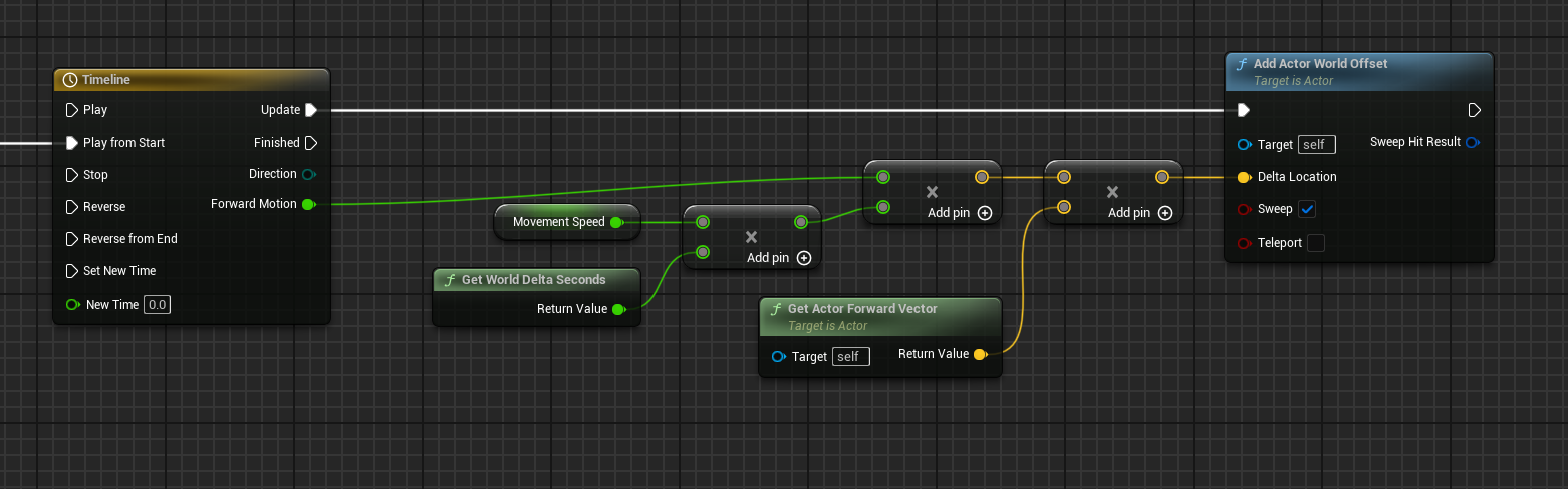 I’ve done the world’s filthiest hack to get around the lack of Root Movement in the animation: a timeline, triggered by an Animation Notify