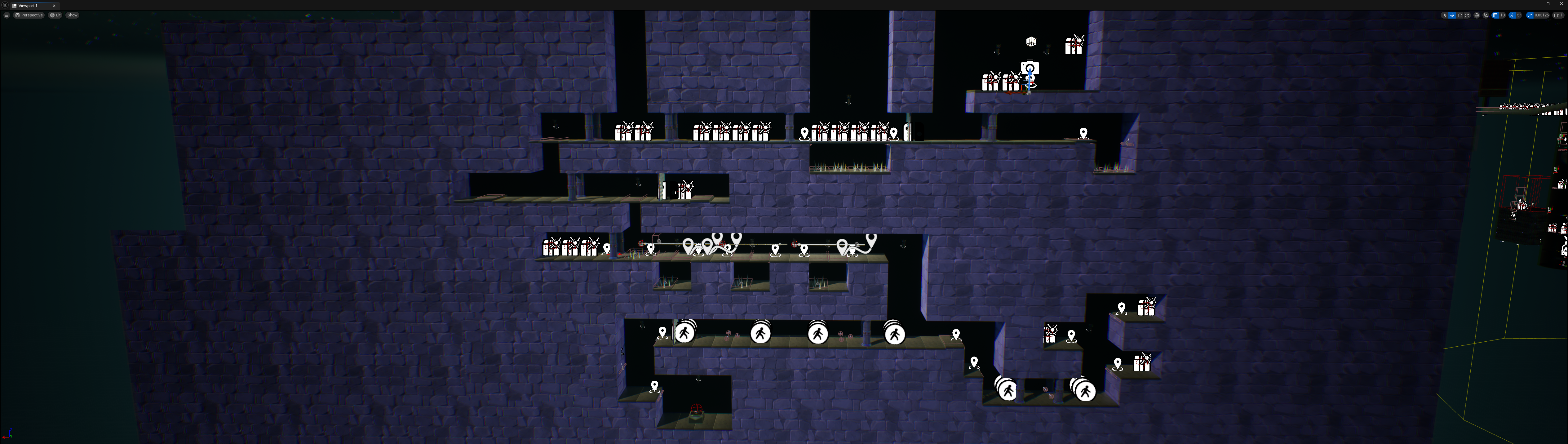 In my original design layout for Willy’s Mansion, I had two hidden exits out of The Attic, one leading to The Battlements, and one to The Roof. Thinking about it, one of these would always be accessible to the player before they’d unlocked the camera, meaning there’d be five possible routes back to the Hub. This feels a little convoluted. I want as many rooms as possible to have hidden exits, but not until the player’s got all their abilities, and has had time to get comfy with the idea that things are hidden in the stuff they didn’t see “the first time”.