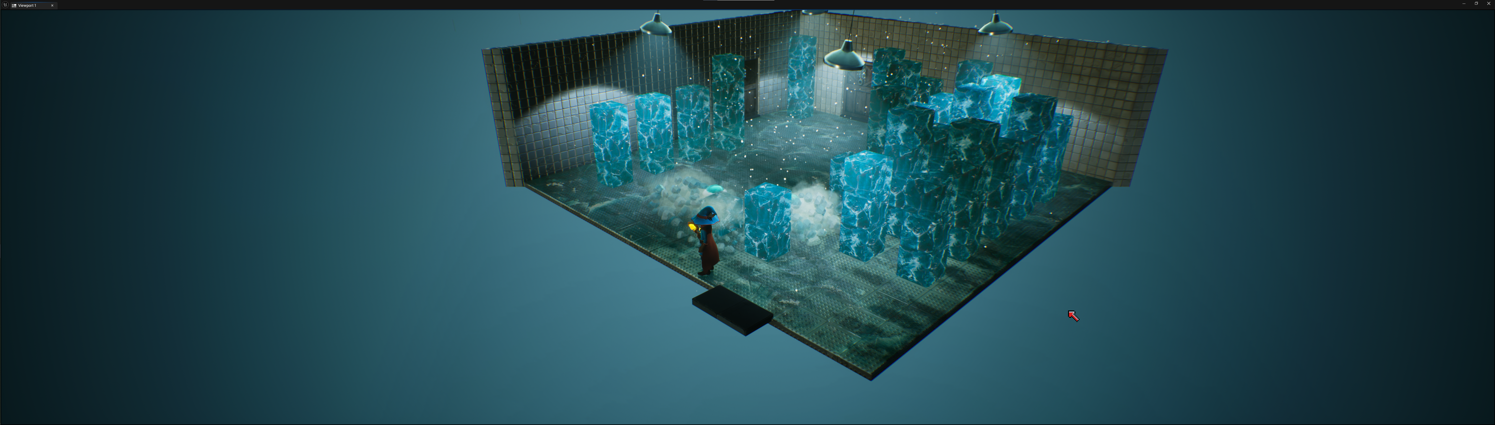 I’ve brought the Bouncers back from the first game, but this time the aim is to let them destroy all the ice cubes. The stacks fall down as each cube is broken, and there’ll be some collectables on top of each, that you can grab. I rolled out Chaos Destruction – UE’s set of tools to do real-time destruction – to handle the cubes smashing, but… it didn’t look particularly nice. Opted instead for an old-fashioned particle effect. There are still some sorting issues, but the fact that I have a little more control over where the particles go, and how quickly they fade out, makes all the difference.