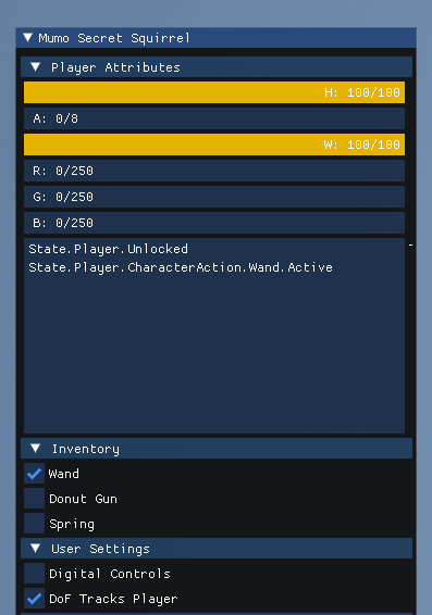 But I did squeak in some Debug Hud: I can see current Tags on the player, Attribute Effects working, and the state of the Inventory. Probably pointless, as I'll have a proper Hud at some point, but until then.