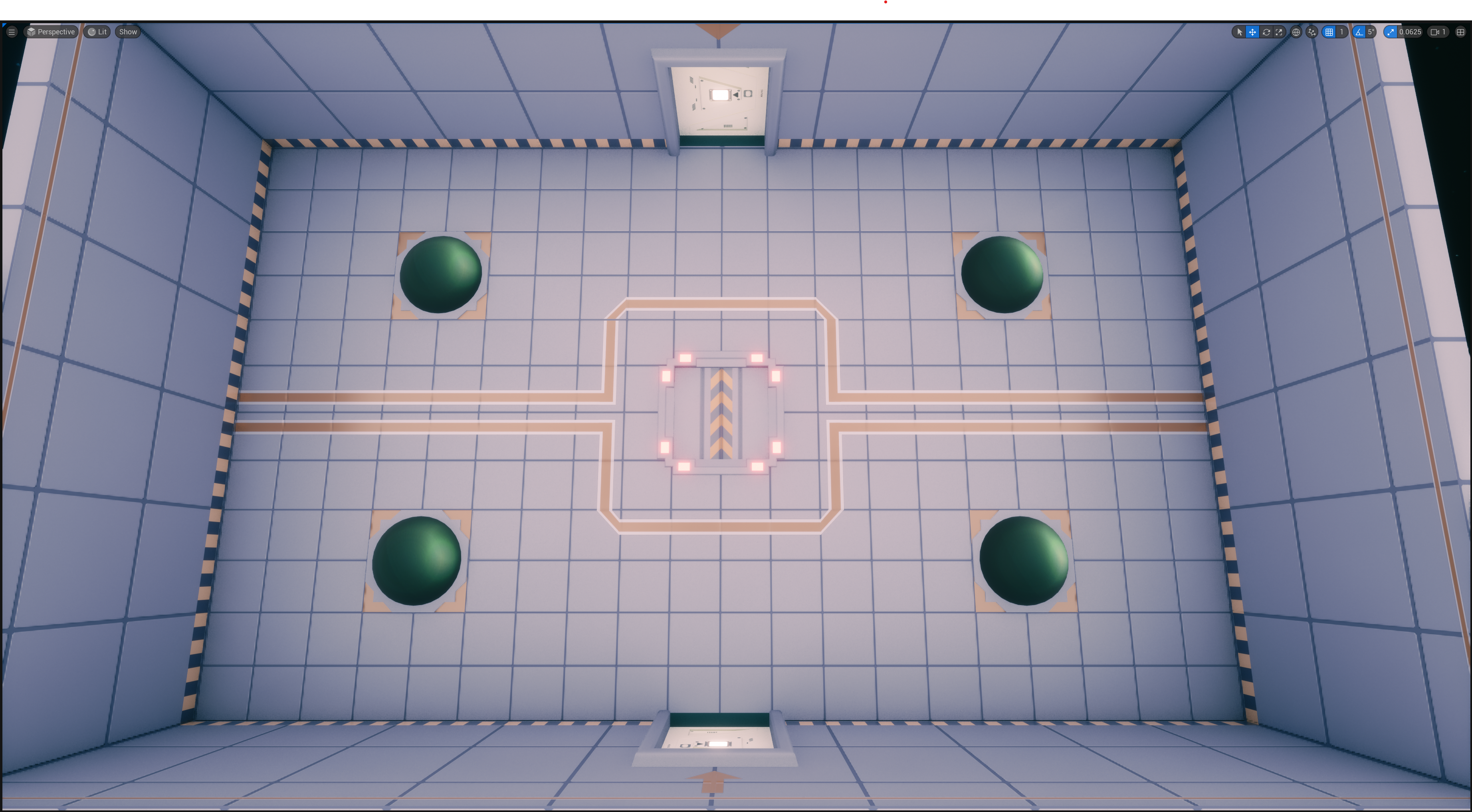 Given the walls fade in & out, depending on camera rotation, I thought it might be cool to have objects in the world fade in and out based on vertical height, so I think this will be the room where I try that out. The trapdoors in the centre hide a lift that’ll take the player to the ship’s 2nd level. When they’re on this, they’ll get a good view of the effect and, hopefully, be curious to try and get there.