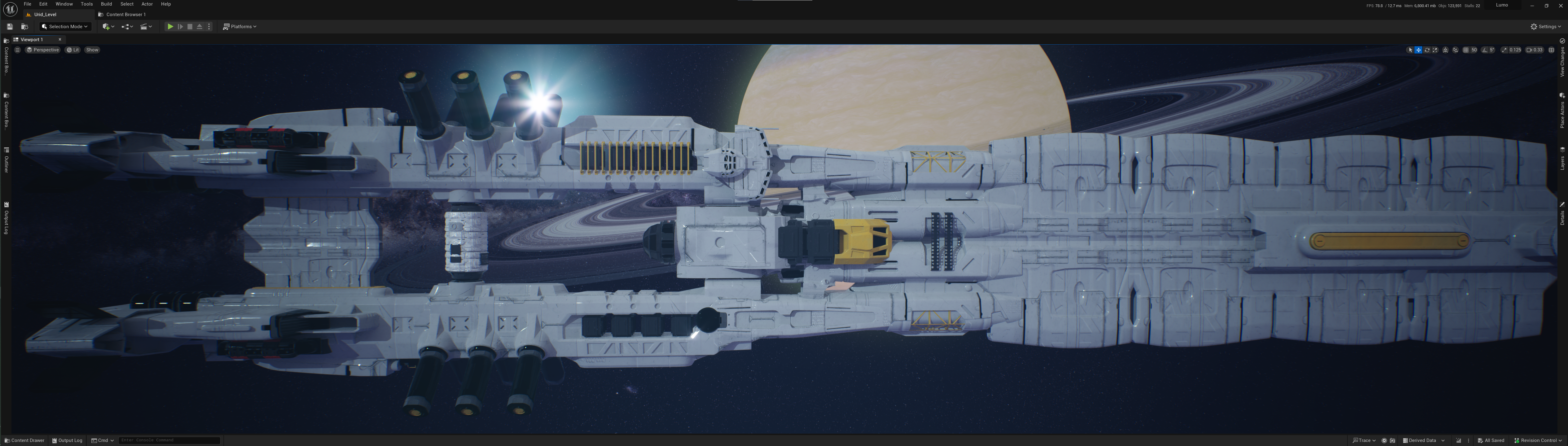 stuff, which is probably why I never finished it. But, waste not, want not. I built a lovely looking level for the space section, and it’s’ perfect for this. I had a hunt around for some kit-bash assets for the dreadnought, and (lucky me) Kitbash3D had a sale on. One of their packs was a spaceship kit, so I yoinked. Also found some explosion assets on the Epic Marketplace, (for a tenner!) that came with audio. Bingo Bongo.