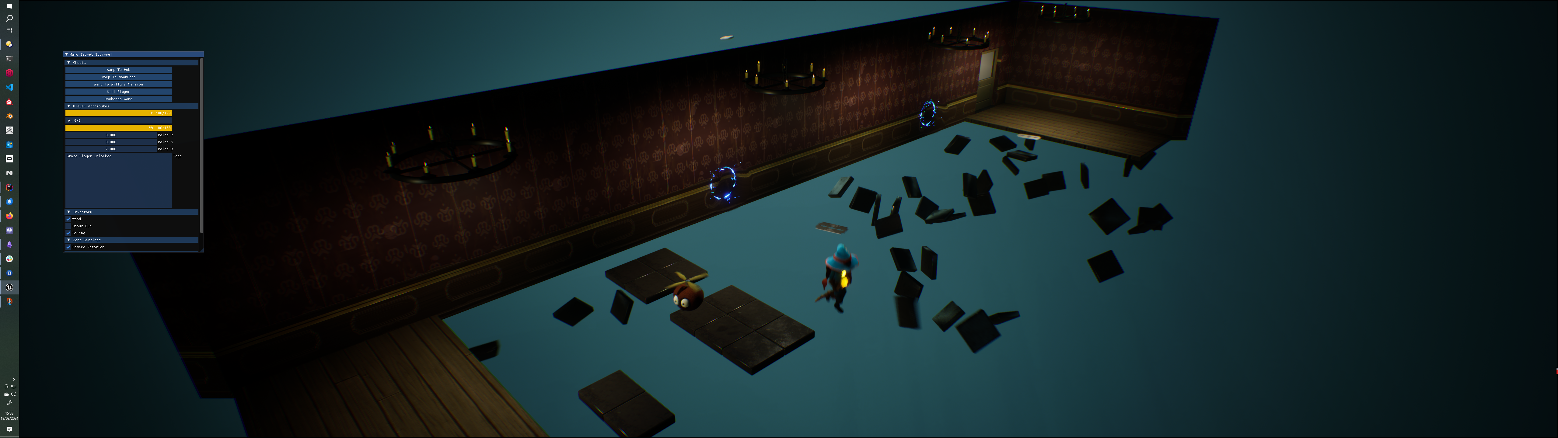 Built the second nightmare room, created a little flying NPC – based on the one in Bob Wakelin’s Head Over Heels key art – and tidied up the razor blades. They now have a nice impact effect, and explode into pieces.